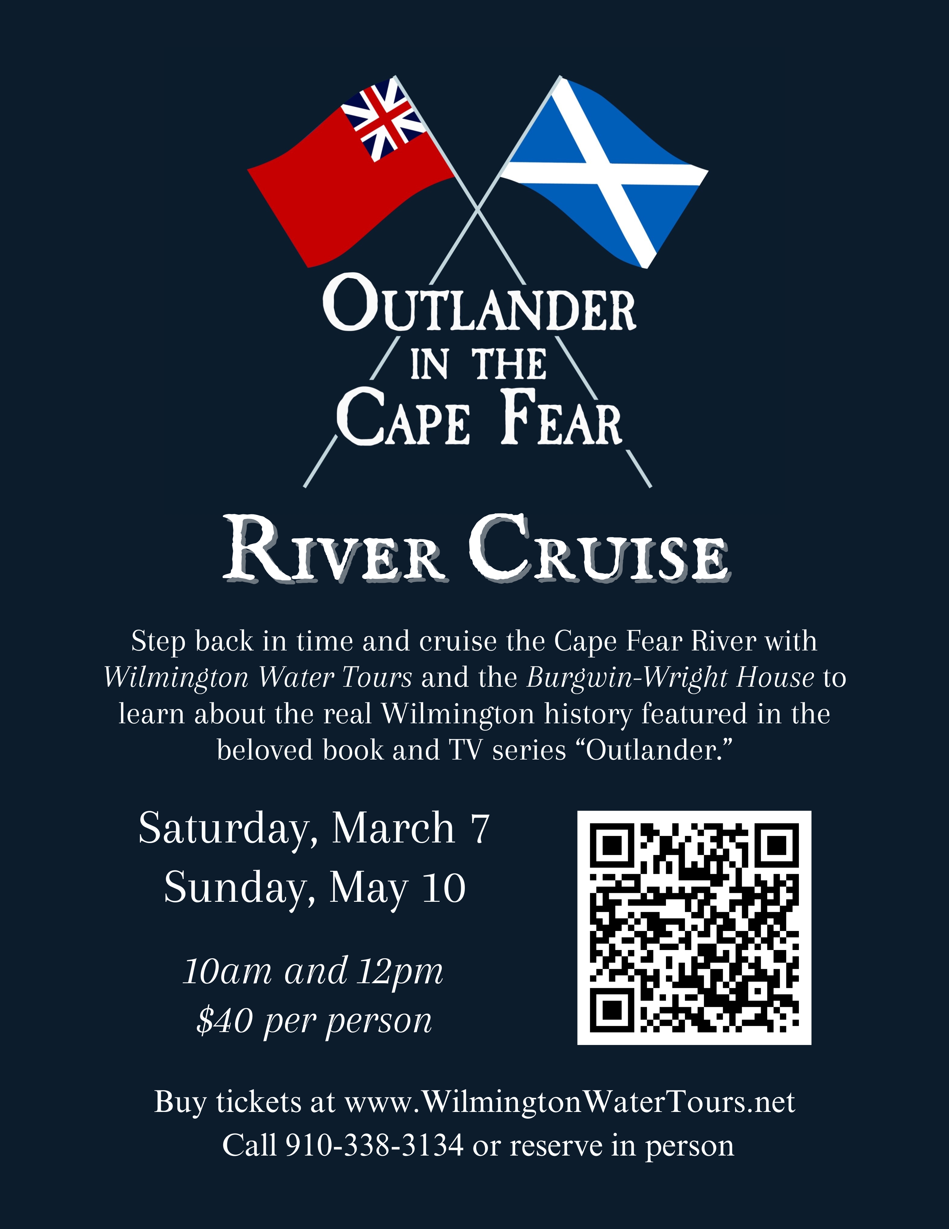 Welcome To Your Home For EVERYTHING "Outlander" In The Cape Fear And Wilmington! The Burgwin-Wright House is the oldest and largest historic site open to the public today in Wilmington, making it the perfect place to learn all about the Colonial North Carolina history that is so important to the "Outlander" book and TV series. Whether it is through our podcast, house tours, waking tours or river cruises, there are so many ways to walk in the footsteps of Claire and Jamie Fraser in Wilmington. Scroll down to learn about all the "Outlander" we offer! The best place to start is with our podcast, "Burgwin-Wright Presents... Outlander In The Cape Fear." Each episode of the podcast takes an event, character or theme from the "Outlander" series and talks about the fact behind the fiction. Listen for free on all podcast platforms including Spotify, Apple Podcasts, Google Podcasts, Stitcher, iHeartRadio, TuneIn or in the player below. "Outlander in the Cape Fear" River Cruise